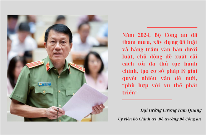 Tiếp tục gương mẫu, đi đầu trong xây dựng, hoàn thiện chính sách pháp luật, thực hiện chuyển đổi số quốc gia, cải cách hành chính. Tham mưu, xây dựng 08 luật và hàng trăm văn bản dưới luật, chủ động đề xuất cải cách tối đa thủ tục hành chính, tạo cơ sở pháp lý giải quyết nhiều vấn đề mới, “phù hợp với xu thế phát triển” như Luật Dữ liệu, Luật PCCC&CNCH, các Nghị định quy định về định danh và xác thực điện tử, thi hành Luật Căn cước… Tham mưu triển khai, thúc đẩy mạnh mẽ các tiện ích công (sổ sức khỏe điện tử, cấp phiếu lý lịch tư pháp, đăng ký xe toàn trình, kiểm soát đăng ký xe, giấy phép lái xe, xử lý vi phạm tạm giữ giấy phép lái xe qua VNeID…), nâng cao hiệu quả quản lý nhà nước về an ninh, trật tự, tạo thuận lợi cao nhất cho phát triển, đồng thời góp phần xây dựng Chính phủ điện tử, chính phủ số, thúc đẩy phát triển kinh tế số, xã hội số.