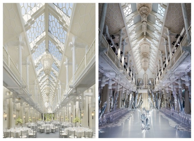 Tại nơi cảnh sắc thơ mộng này, Chung Thanh Phong chọn Reception Hall (trái) làm nơi dựng sàn catwalk (phải). Reception Hall là lễ đường hoàn hảo cho đám cưới và những buổi tiệc cocktail đẳng cấp. Nơi này được thiết kế với tông màu kem, ngập tràn ánh sáng với mái lợp bằng kính trong suốt cùng khu vực riêng dành cho ban nhạc sống.