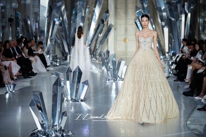 Trong khung cảnh siêu thực xen lẫn nét sang trọng của đại sảnh, người mẫu khoác lên mình những bộ đầm Haute Couture, sải bước uyển chuyển.
