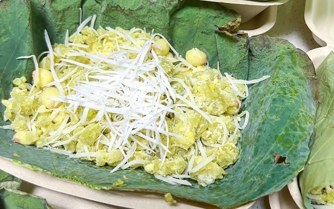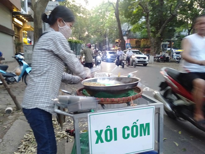 Cô xôi cốm vừa đon đả đơm xôi vào hộp vừa cho biết: “Chúng cháu mua cốm thành phẩm về rồi đồ. Kiểu đồ như đồ xôi ấy bác ạ!”. Tôi đồng tình: “Thế mới gọi là xôi cốm chứ”. Cô nói thêm: “Để làm mới cốm truyền thống thì ngoài đồ thành xôi, chúng cháu còn dùng thêm đỗ xanh nữa. Đấy chỗ có màu vàng vàng ấy. Đỗ sau khi chà vỏ xong thì chúng cháu cũng đồ chín. Chỉ có khác là không đồ lẫn với cốm mà đồ riêng. Thêm nữa chúng cháu còn bổ sung cùi dừa, thứ cùi được nạo thành sợi nhỏ. Có điều, để đảm bảo khâu vệ sinh nên cùi dừa đã nạo còn được xào chín. Làm như thế người ăn sẽ thấy yên tâm”.
